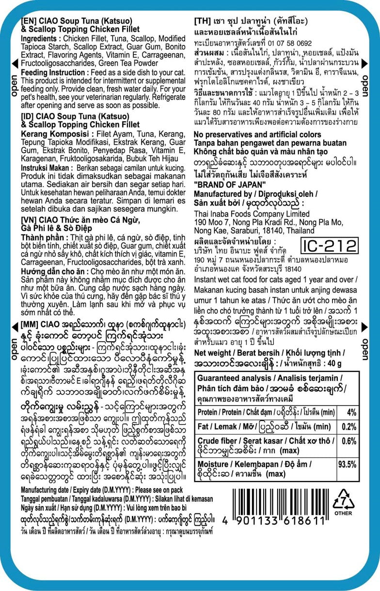 Delight your cat with CIAO Clear Soup Pouch Katsuo Tuna, Scallop & Chicken Fillet. This nourishing recipe combines the rich taste of tuna (katsuo), the sweetness of scallop, and tender chicken fillet, all served in a light, hydrating broth. ππ¦ͺππ²