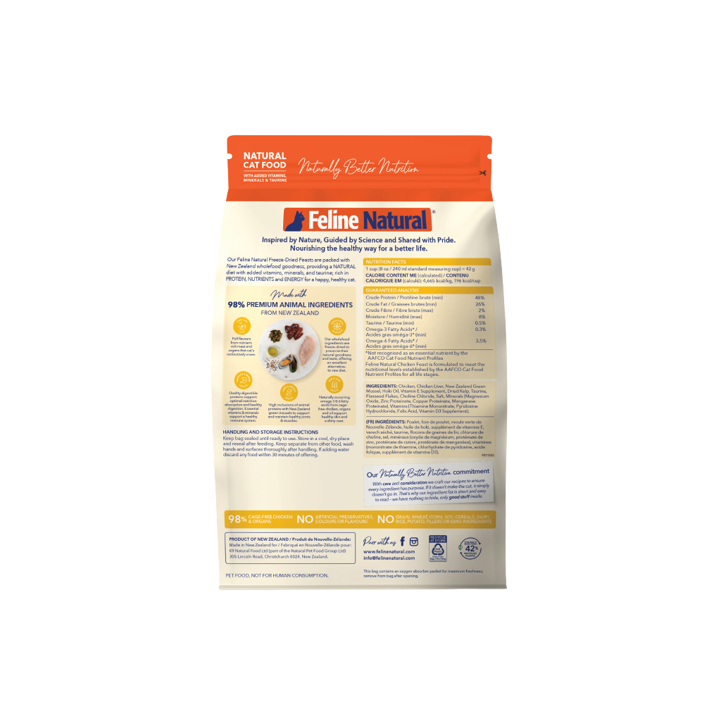 Feline Natural Freeze-Dried Chicken Feast is a single-protein, high-protein raw meal crafted from 100% New Zealand free-range chicken. Freeze-dried to preserve natural nutrients and flavour, it offers your cat a convenient, clean, and complete raw feeding experience. Serve dry or rehydrate for a moisture-rich, irresistible bowl every time.