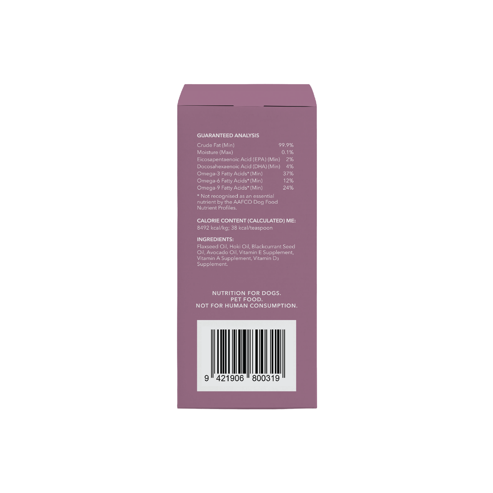 Crude Fat (min): 99.9% Moisture (max): 0.1% EPA (Eicosapentaenoic Acid): 310mg DHA (Docosahexaenoic Acid): 480mg Vitamin E (min): 1 IU