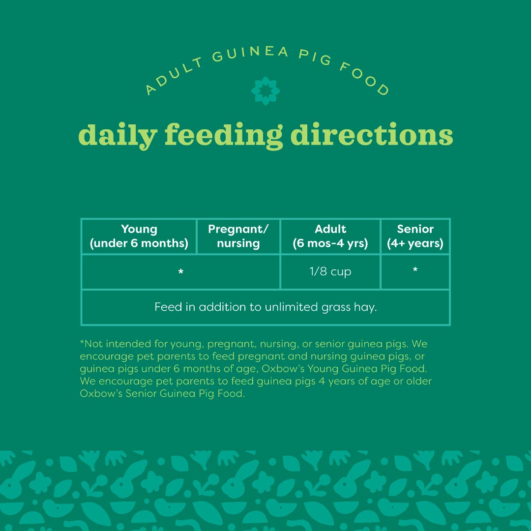 Feed 1/8 cup of pellets daily per adult guinea pig, along with unlimited organic grass hay and fresh water. Supplement with a variety of fresh vegetables for additional enrichment. Adjust as needed based on your guinea pig’s weight, age, and activity level.